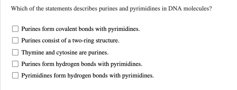 Pyrimidines forms hydrogen bonds with purines. Purines form hydrogen bonds with pyrimidines. Up to 256 cash back which of the following statements describes purines and pyrimidines in DNA molecules.